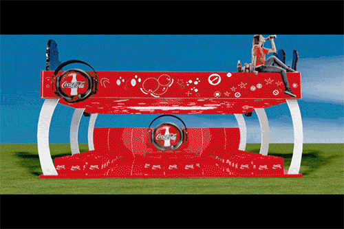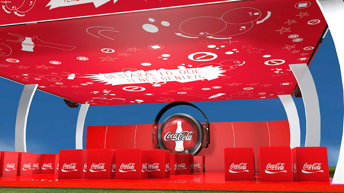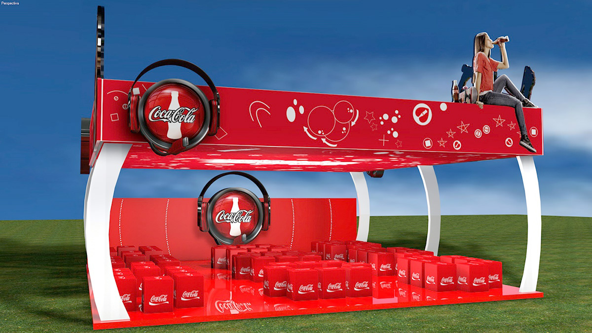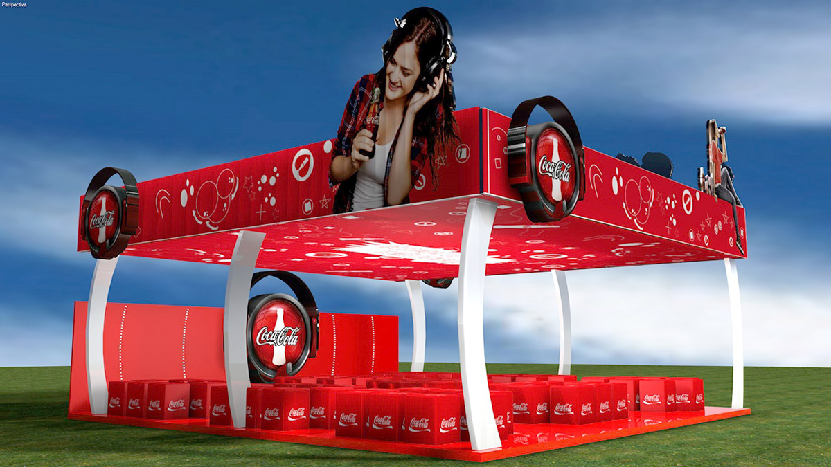 2. Diseño de Stand 3D para Evento «Red Sound»: Tomé la iniciativa de proponer un diseño de stand en 3D para el evento musical «Red Sound». Modelé una estructura moderna y llamativa que integraba la marca Coca-Cola de una forma dinámica, pensada para ser el centro de atención del evento.
